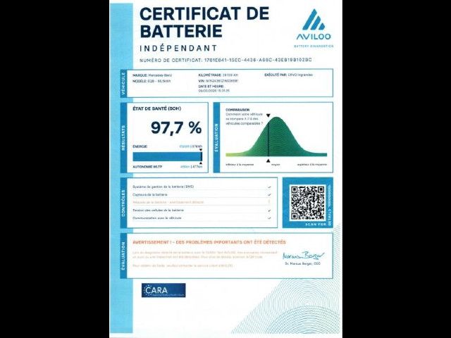 [8] La garantie batterie Mercedes‑Benz est valable en complément de la responsabilité légale pour vices matériels et de la garantie Mercedes‑Benz sur les véhicules neufs, pour une durée totale de 8 ans à compter de la livraison ou de la première immatriculation (la date la plus ancienne prévalant), ou jusqu’à un kilométrage maximal de 160 000 km (la première des deux échéances prévalant).